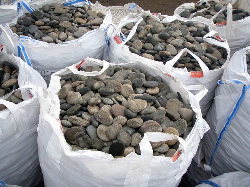 Крупная галька этого типоразмера (от 100 до 300 мм) уже напоминает небольшие валунчики: это красивый и гладкий речной камень, получивший свою округлую форму от сил природы – волн и течений. Благодаря удобной уплощенности отделка этим натуральным камнем становится очень простой: по сути, это готовая естественная облицовочная плитка или брусчатка для мощения. Такая галька, цена которой у нас низка благодаря собственной добыче, отпускается в мягких контейнерах или насыпом в кузов машины, тоннами. Эти симпатичные плоские натуральные камни у нас можно поистине удачно купить оптом!